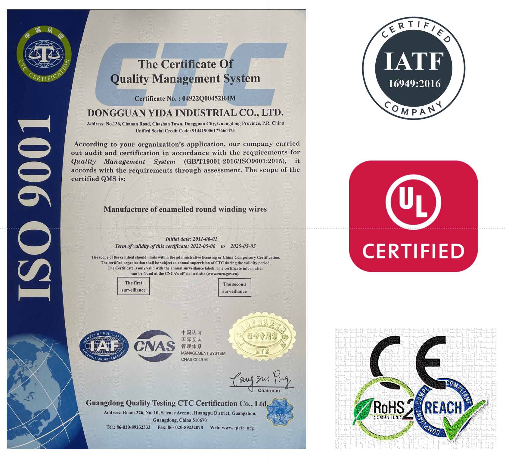 益达拥有ISO 9001、ISO 14001、IATF 16949和RoHS等重要认证。这些认证体现了我们对质量管理、环境保护、汽车品质标准和制造过程中有害物质限制的坚定承诺。